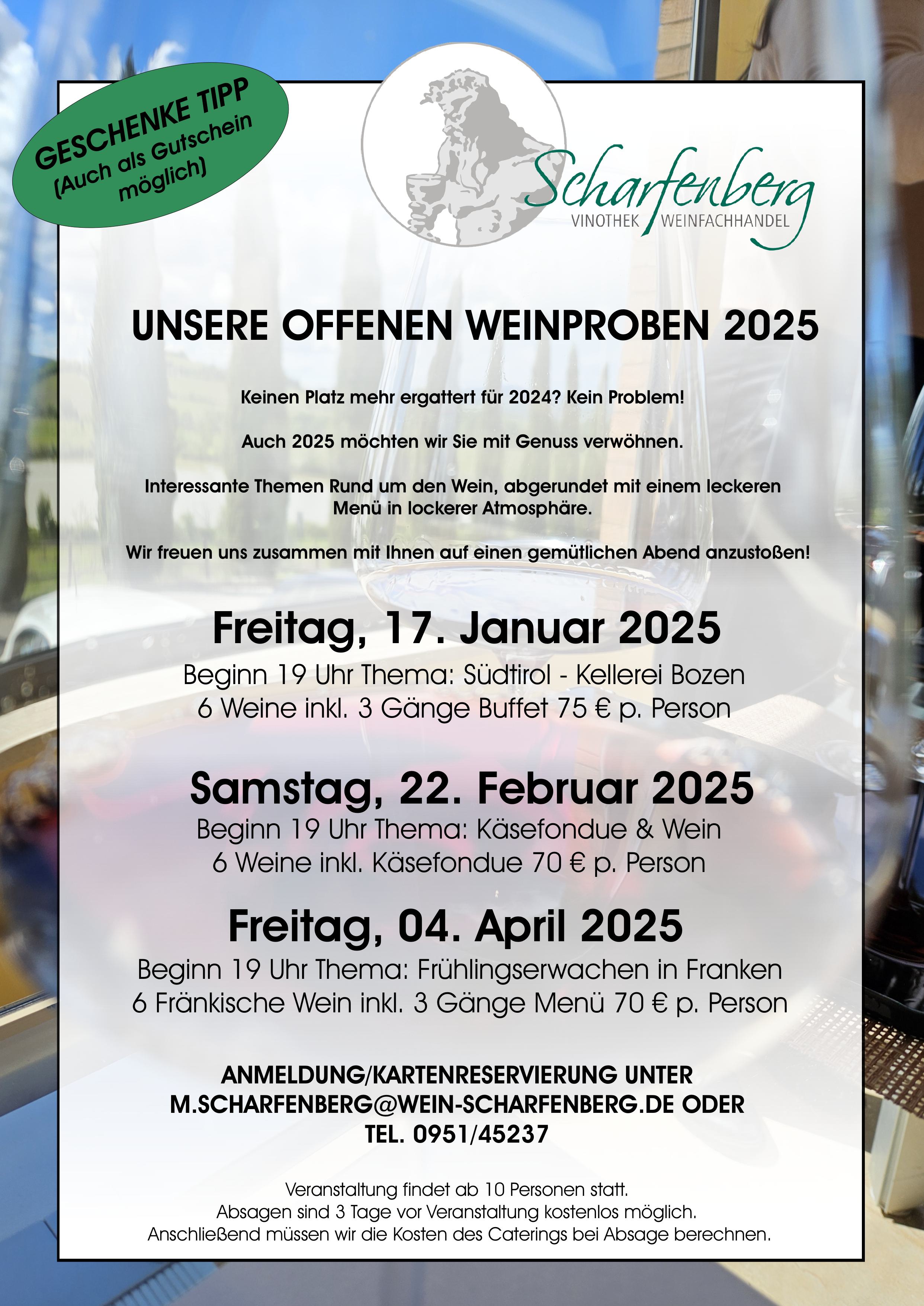 (Schreibt eine kurze E-Mail an m.scharfenberg@wein-scharfenberg.de mit Namen, Personenanzahl und für welches Datum Ihr euch anmelden möchtet)
